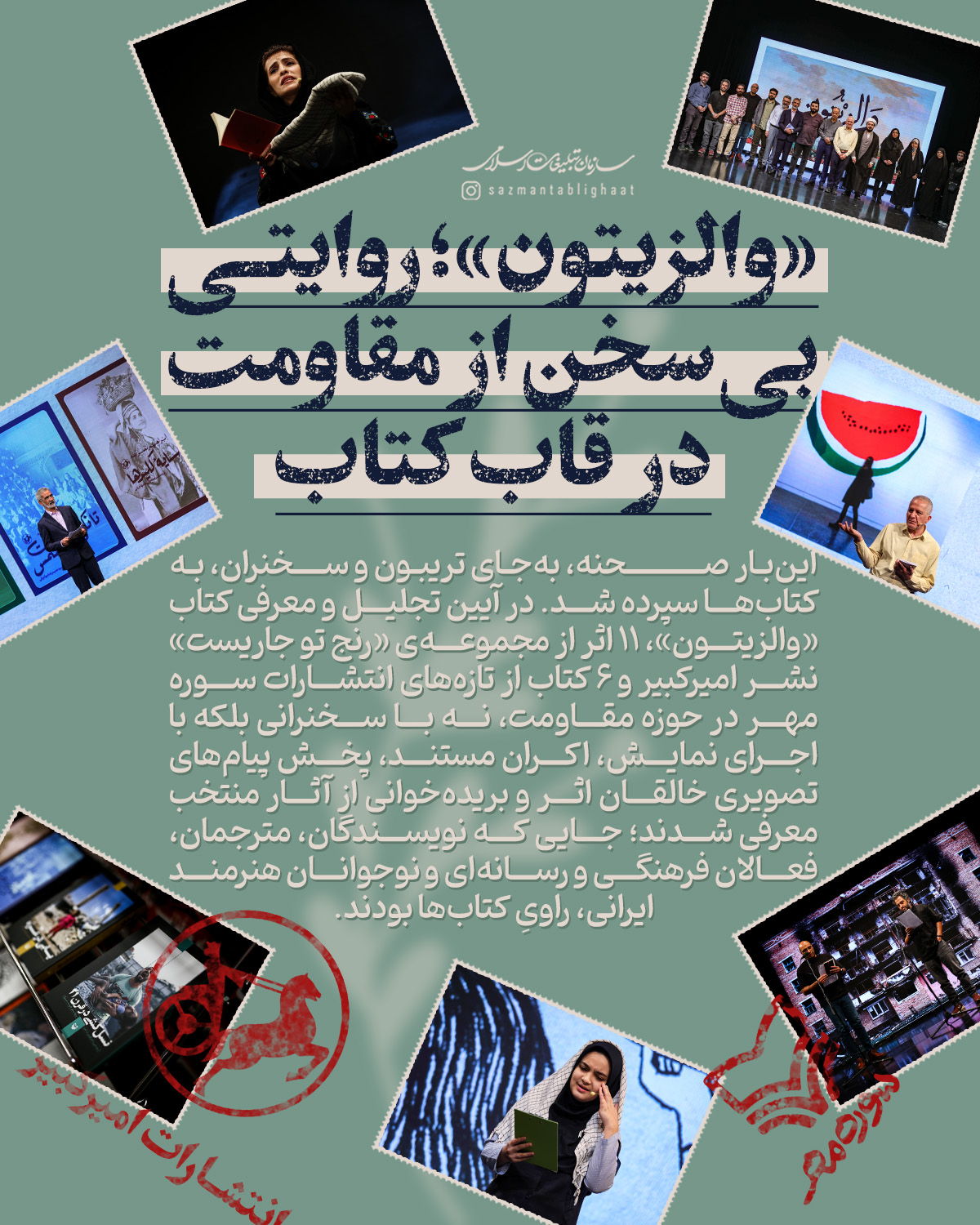 به گزارش روابط عمومی سازمان تبلیغات اسلامی، در آیین تجلیل و معرفی کتاب «والزیتون»، ۱۱ اثر از مجموعه‌ی «رنج تو جاریست» نشر امیرکبیر و ۶ کتاب از تازه‌های انتشارات سوره‌مهر در حوزه مقاومت، نه با سخنرانی بلکه با اجرای نمایش، اکران مستند، پخش پیام‌های تصویری خالقان اثر و بریده‌خوانی از آثار منتخب معرفی شدند؛ جایی که نویسندگان، مترجمان، فعالان فرهنگی و رسانه‌ای و نوجوانان هنرمند ایرانی، راویِ کتاب‌ها بودند.