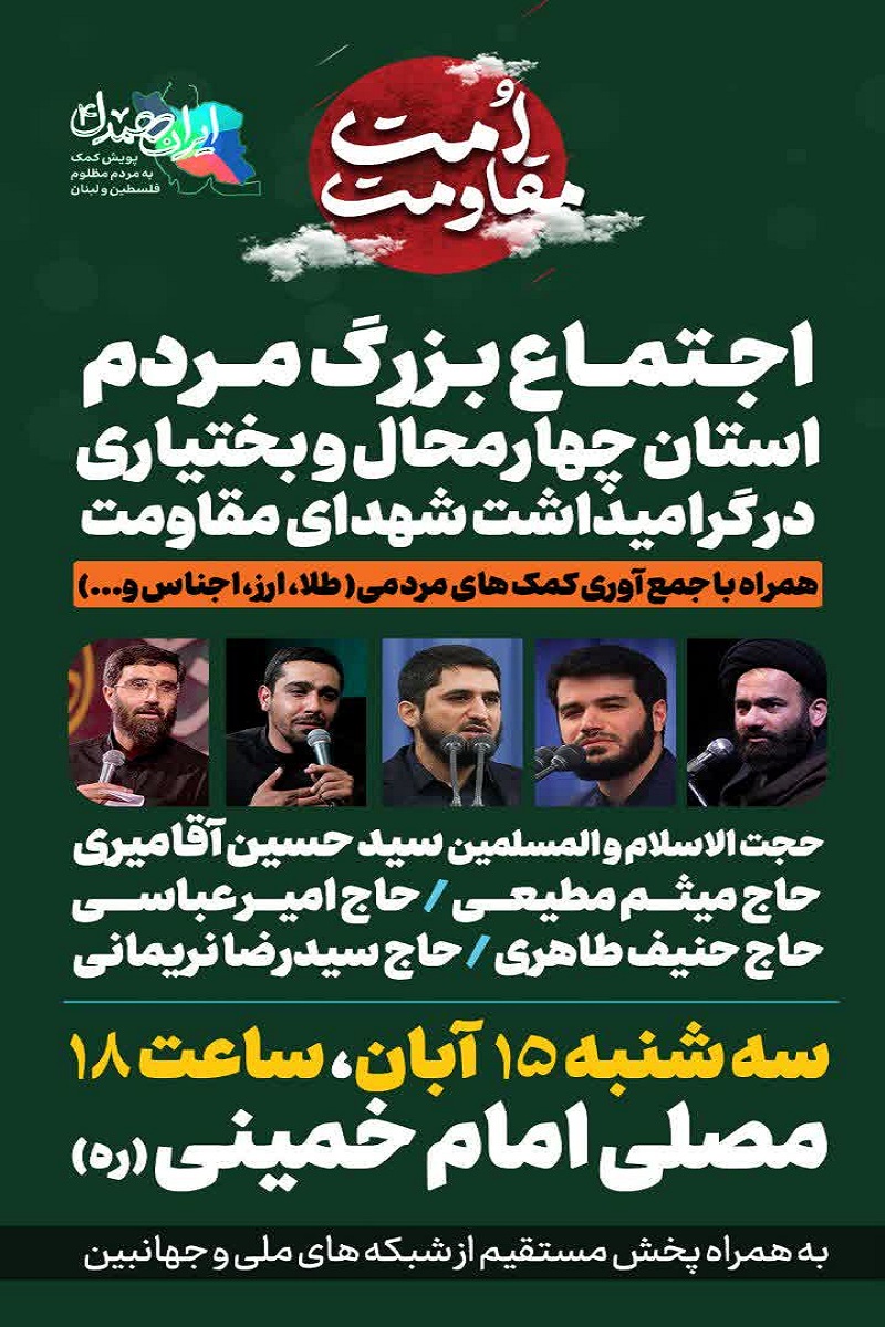 اجتماع بزرگ «امت مقاومت» همراه با جمعآوری کمکهای مردمی به جبهه مقاومت روز سهشنبه ۱۵ آبان ماه در مصلی امام خمینی(ره) شهرکرد برگزار میشود.