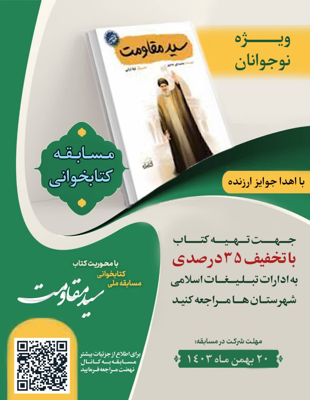 وی با اشاره به برگزاری مسابقه کتابخوانی از کتاب «سید مقاومت»، گفت: این کتاب به معرفی شهید سید حسن نصرالله میپردازد و محتوای نوجوانانه دارد که علاقهمندان در سراسر استان چهارمحال و بختیاری میتوانند با مراجعه به ادارات تبلیغات اسلامی شهرستان خود این کتاب را با تخفیف ۳۵ درصدی تهیه و در مسابقه شرکت کنند.