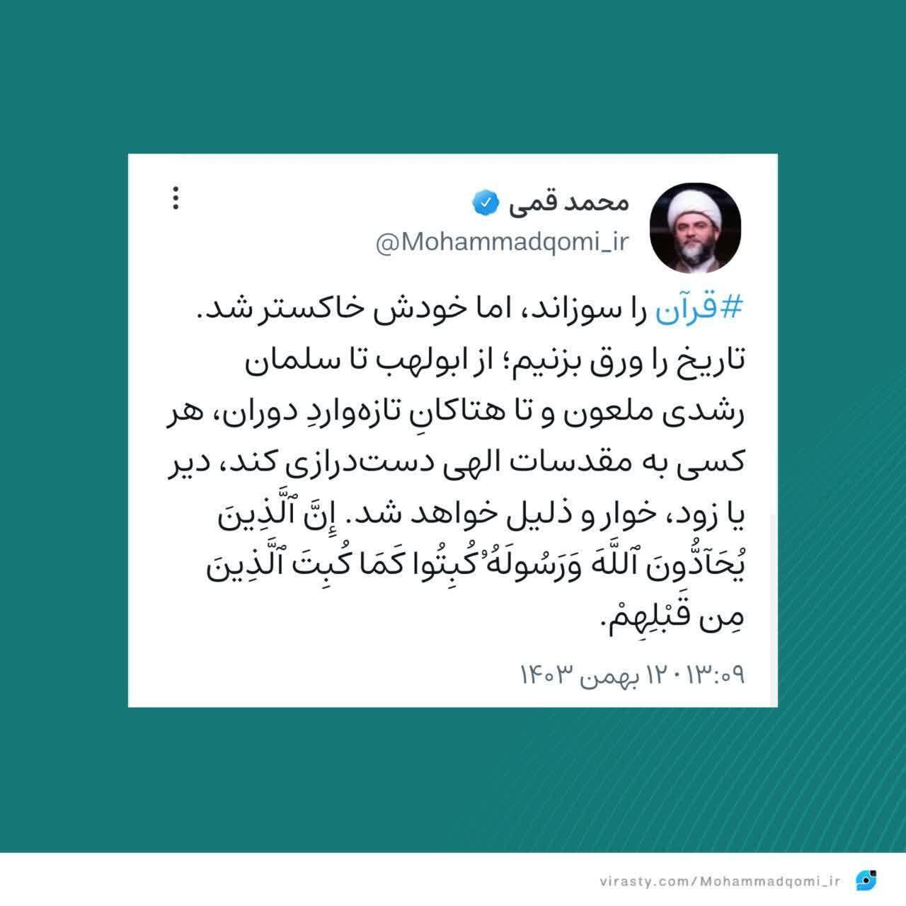 ۱۲ بهمن | واکنش حجتالاسلام قمی به انتشار خبر به هلاکت رسیدن فرد توهین کننده به قرآن؛