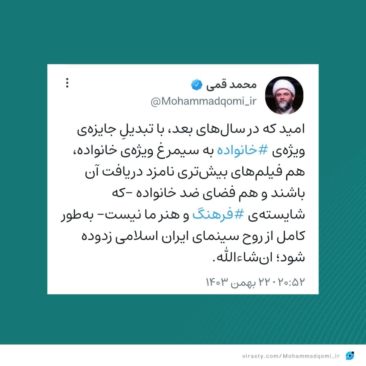 رئیس سازمان تبلیغات اسلامی همزمان با اختتامیهی چهل و سومین دورهی جشنوارهی فیلم فجر در صفحه شخصی خود در شبکه ویراستی متنی منتشر کرد.