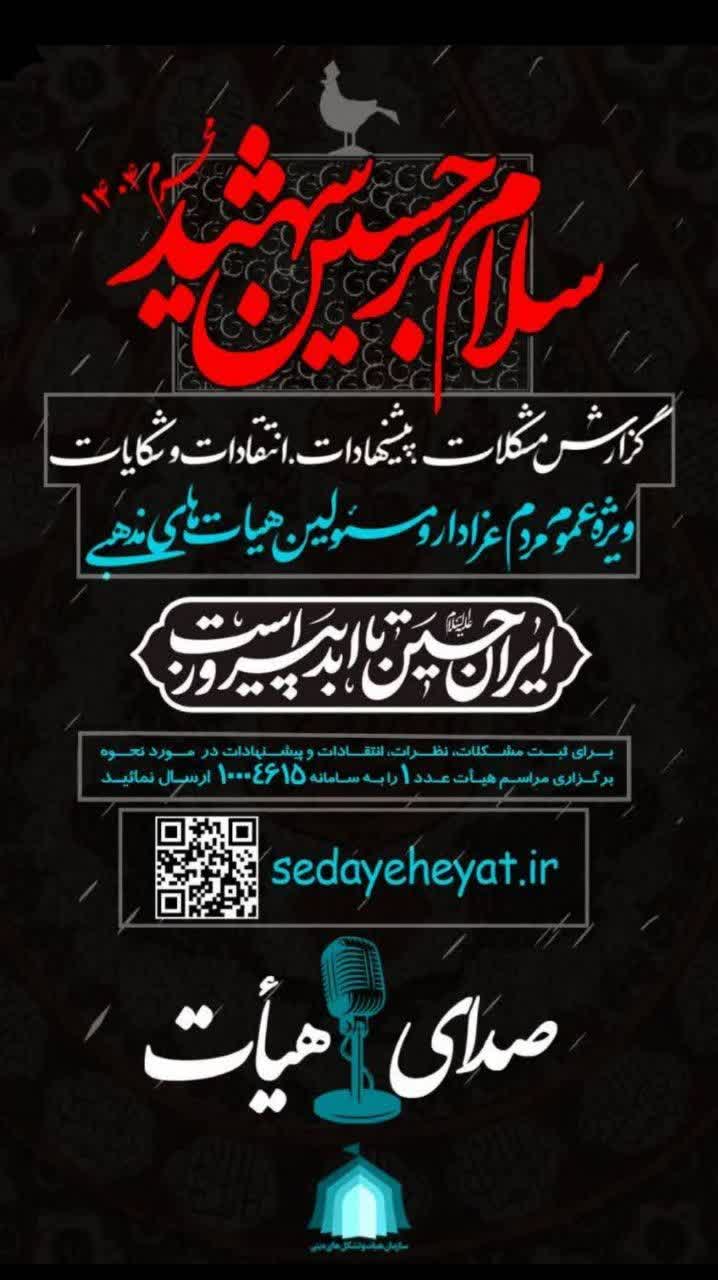 سامانه صدای هیأت امسال نیز در خدمت عموم عزاداران و مسئولین هیئات حسینی در سراسر کشور است و مخاطبان میتوانند با ارسال عدد ۱ به سامانه ۱۰۰۰۴۶۱۵ یا مراجعه به سامانه sedayeheyat.ir گزارشهای خود را ثبت نمایند.