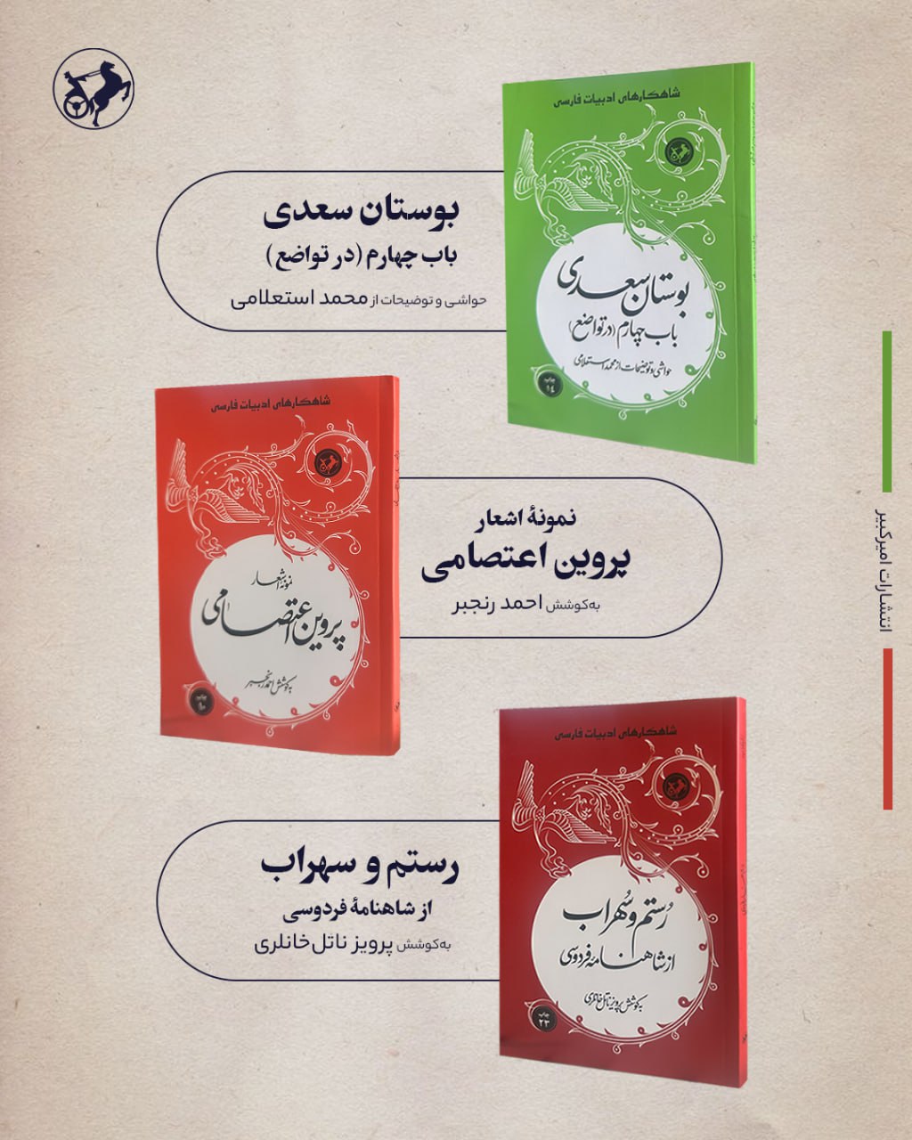 انتشارات امیرکبیر، با افتخار از انتشار مجموعهی «شاهکارهای ادبیات فارسی» خبر داد. این مجموعهی فاخر، یک گزیدهی بینظیر از ارزشمندترین آثار ادبیات کهن ایران است که شامل اشعار شورانگیز و حکایات دلنشین از بزرگان سخن پارسی، همچون فردوسی حماسهسرا، نظامی گنجوی قصهپرداز، پروین اعتصامی نکتهسنج و دیگر نامآوران ادب ایرانزمین میشود.